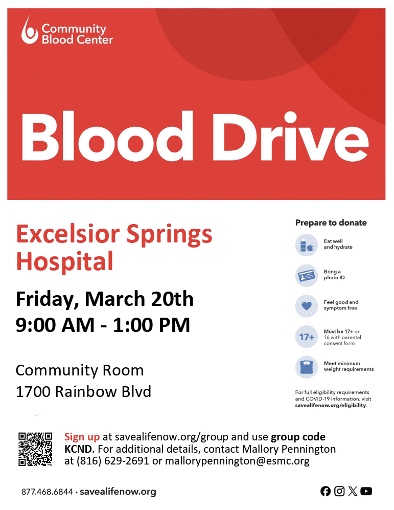 Join us in helping save lives right here in our community! Excelsior Springs Hospital is partnering with the Community Blood Center to host a Blood Drive on Friday, March 20th from 9:00 AM to 1:00 PM in the Community Room at 1700 Rainbow Blvd.